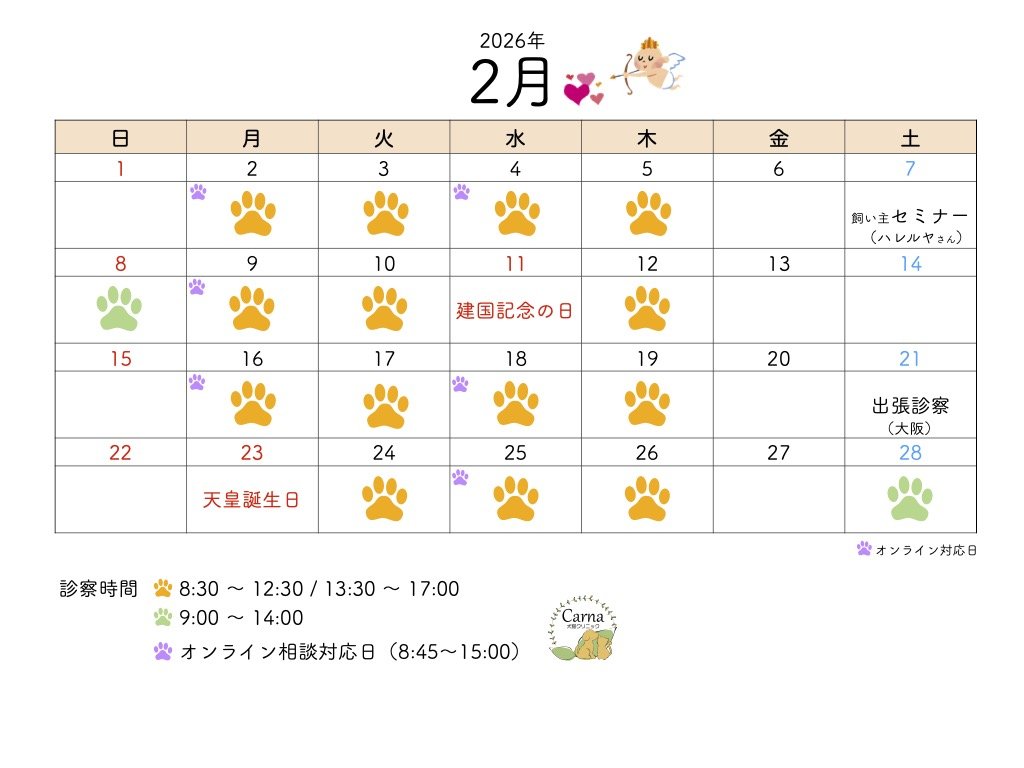 🐾 2月の日曜日診察は8日 土曜日診察は28日(9:00〜14:00)